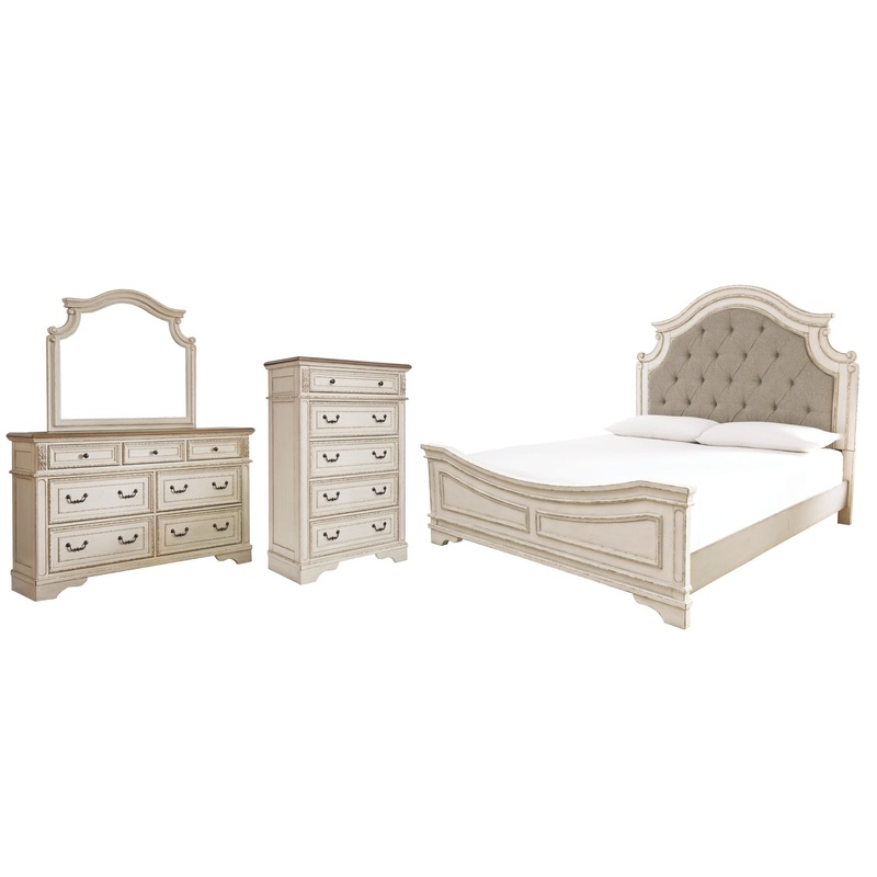 Realyn Queen Upholstered Panel Bed with Mirrored Dresser and Chest
