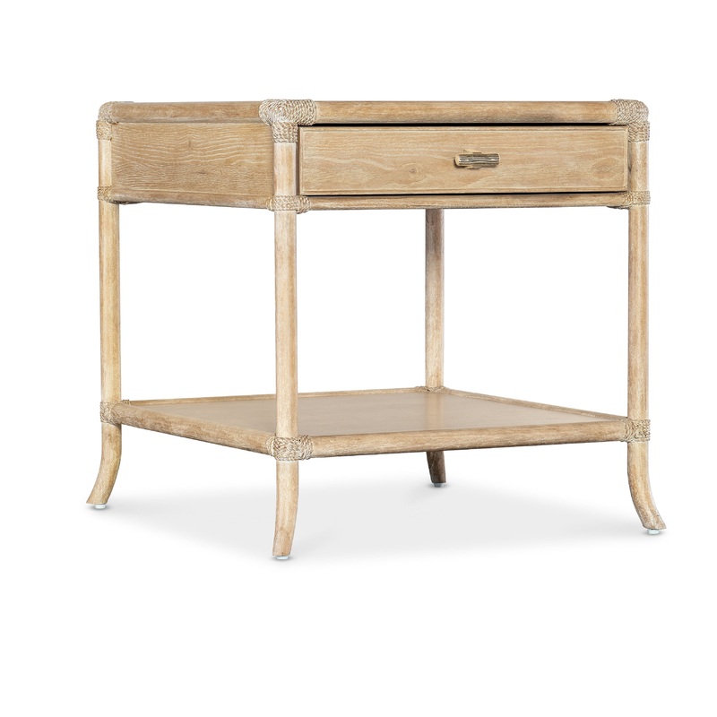 Inspired by tropical getaways, the Retreat Pole Rattan End Table is a mixture of natural materials in a laid-back, versatile design. Crafted of Oak and Maple Veneers with Rope accents at the joints, the table is finished in the sand-colored, transparent by design to showcase the unique grain patterns of the wood veneer. Finished on all sides, the table has one self-closing drawer, one fixed shelf and is accented by soft pewter-colored T pulls.
