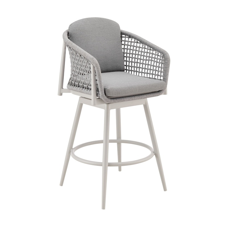 Introducing the Rhodes Outdoor Patio Swivel Bar or Counter Stool a harmonious blend of contemporary design and outdoor functionality meticulously crafted to redefine your outdoor experience. This versatile stool seamlessly marries the sleek allure of aluminum with the tactile elegance of rope detailing and the luxurious comfort of removable cushions, creating a sophisticated and enduring piece of outdoor furniture. Crafted with precision, the Rhodes Outdoor Patio Swivel Stool features a robust aluminum frame, ensuring durability and a modern aesthetic that effortlessly complements various outdoor settings. Available in both 26-inch and 30-inch heights, this stool caters to both bar and counter heights, offering versatility to meet your specific needs. The water-resistant and UV-resistant features of the Rhodes Stool make it a resilient choice for your outdoor space. The solution-dyed acrylic fabric ensures vibrant colors and resistance to fading, offering lasting beauty in the face of changing weather conditions. Whether bathed in sunlight or facing unexpected rain, this stool stands as a steadfast and stylish seating solution for your patio or outdoor bar area. The incorporation of rope detailing adds a unique tactile dimension to the design, creating a visually appealing contrast with the smooth aluminum frame. Paired with removable cushions with a zippered cover, the Rhodes Swivel Stool invites you to relax in both style and comfort, providing a sumptuous seating option for your outdoor gatherings. Whether you’re enjoying a refreshing drink at the bar or a casual meal at the counter, the swivel feature of the Rhodes Stool enhances mobility, allowing you to effortlessly engage with your surroundings. Elevate your outdoor lounging experience with the Rhodes Outdoor Patio Swivel Bar or Counter Stool in Aluminum.