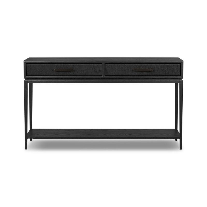 Transform your space with the sleek and refined Rosenell 2-Drawer Console Table from Four Hands. Crafted from premium oak, choose from a black or natural finish to elevate your living space or media room. Two drawers with woven paper cord add stylish storage, while lower open shelving allows for display options. A perfect addition for smaller spaces.