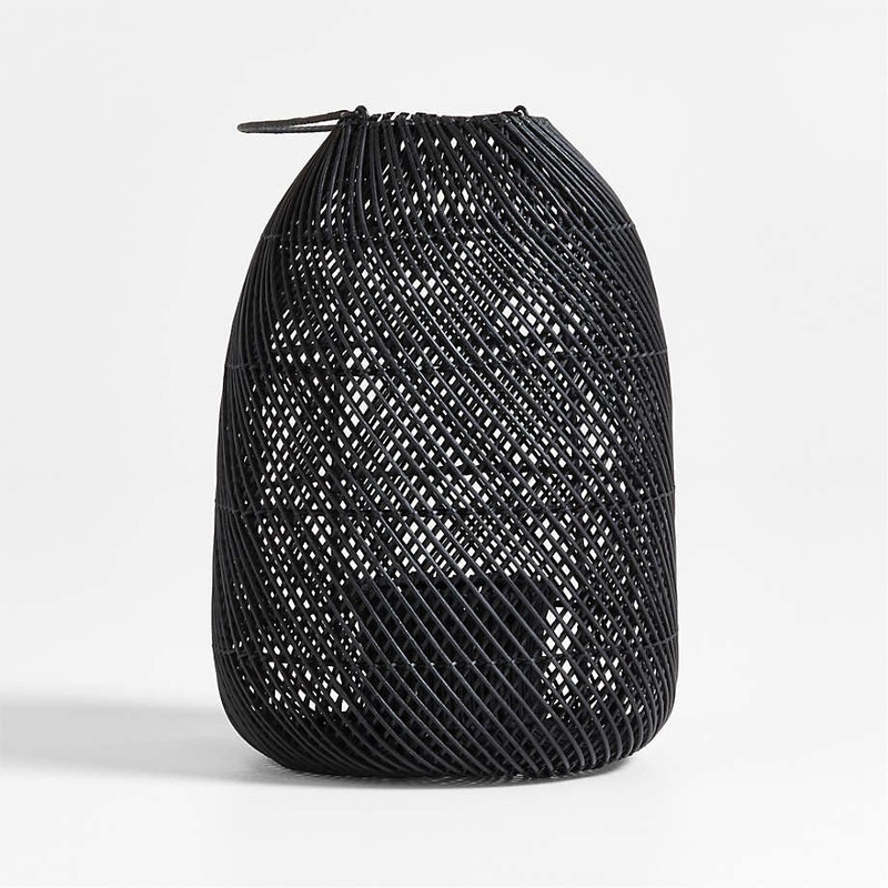 Create an intriguing display of candlelight and shadow with our large Rota lantern. Woven by talented artisans, black-stained rattan swirls an intricate crosshatch that casts light in a gorgeous diamond pattern. We love the way Rota adds a touch of drama to coastal-inspired decor.Rota Black Woven Lantern 17″17″Hheight24.5″dia.diameterMeasurements are in inches.HandwovenRattan with black stainIron frameAccommodates a flameless candle up to 4″ dia.Do not use handle for hanging lanternFor indoor use onlyWipe clean with damp clothMade in Indonesia