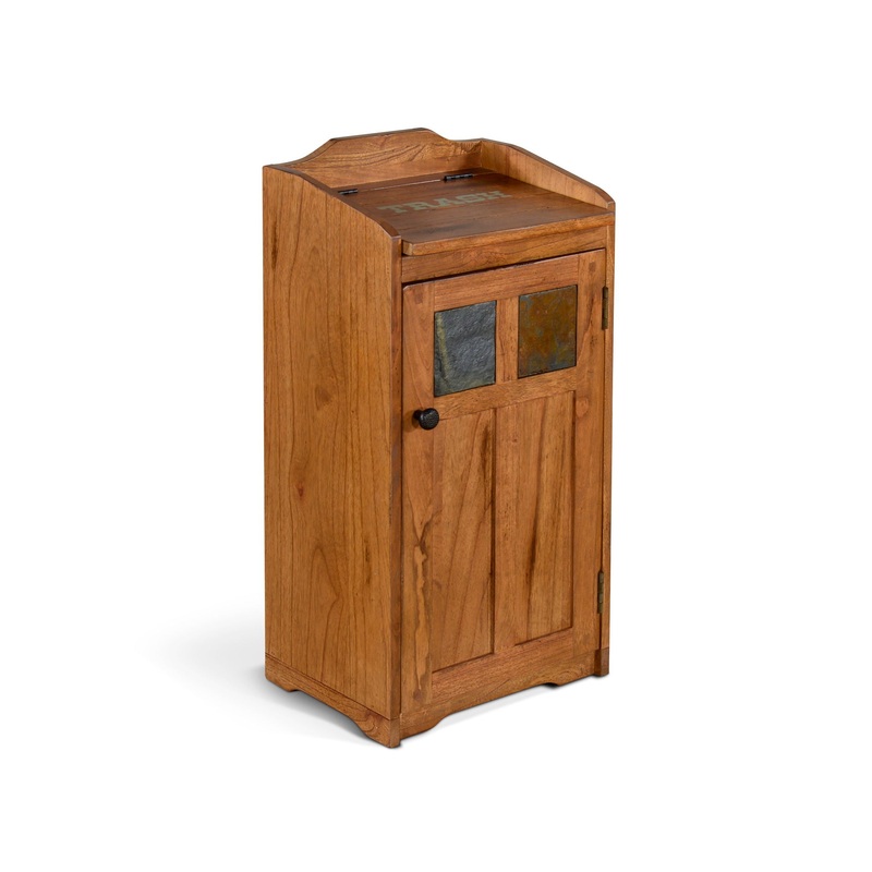 The Sunny Designs single trash bin is the perfect addition to any home with its rustic oak finish and charming natural slate accented inserts. This functional and traditional storage bin is compatible with a 13-gallon trash can and features an easy-access, drop-down lid in addition to the bin access door with a distressed metal knob. Made from quality oak solids and veneers, the bin is delivered to your home fully assembled for your convenience!