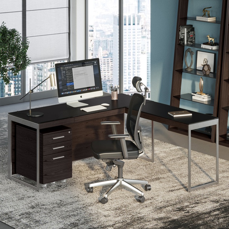 Featuring satin-etched glass work surfaces, and natural wood finishes, and boasting a host of innovative design features, BDIs sequel office collection creates workspaces that are equal parts of organization and inspiration. BDI Color (Top/Frame): Charcoal Stained Ash/Satin Nickel