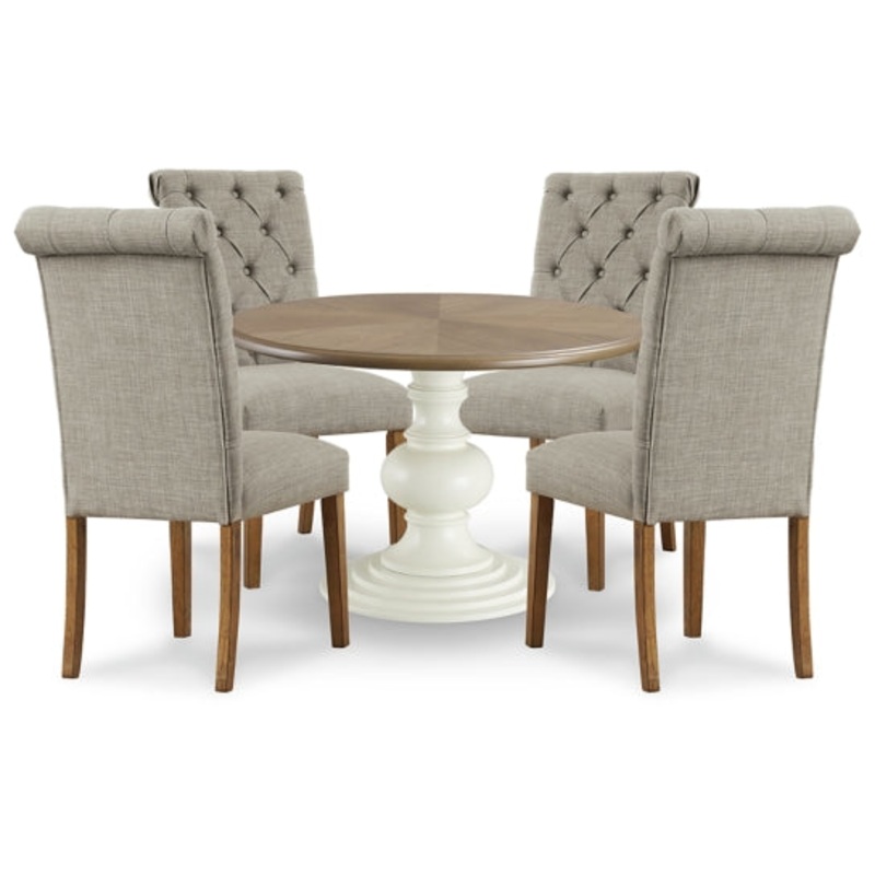 This dining package provides a charming allure for your decor. The round dining table features a touch of carved detail, making the most of the wood’s natural variation. An antiqued cream-colored finish on the turned pedestal base beautifully complements the tabletop, creating a warm cottage-chic look. The cushioned chairs are delightfully cozy, with upholstered seats and carefully tailored button-tufted backs.