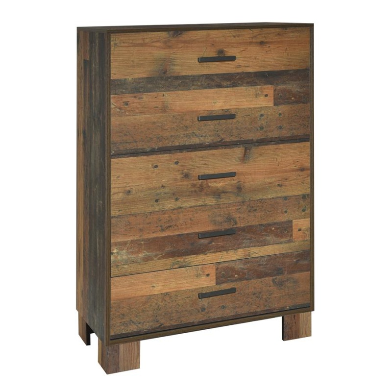 Turning a modern guest or master suite into a forested retreat, this tastefully designed chest adds to the overall essence of a classic space. Notable gradations stand out in the rustic pine finish of this five-drawer chest. Strive for a cabin motif in this contemporary chest with dark bronze matte metal hardware and linear styling. Finished drawer boxes with front and rear English dovetail construction and center drawer glides ensure smooth operation, as drawer space is plentiful in creating room for essentials. This inspiring chest transforms a conventional space into a woodsy cabin setting.