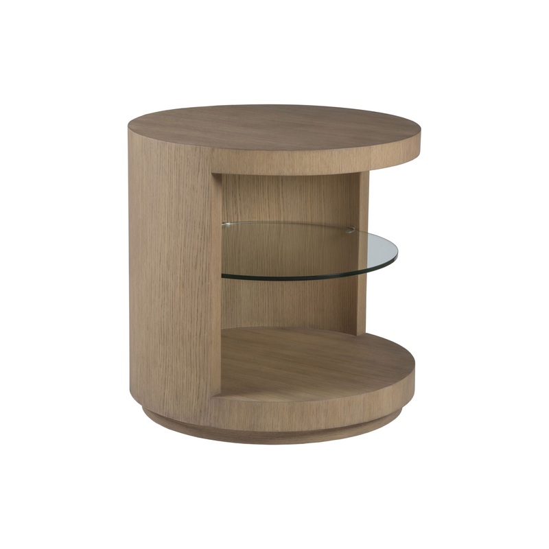 - Cylindrical Contemporary Side Table Standing On A Plinth Base, Featuring A Half-side Opening Revealing A Tempered Glass Shelf.