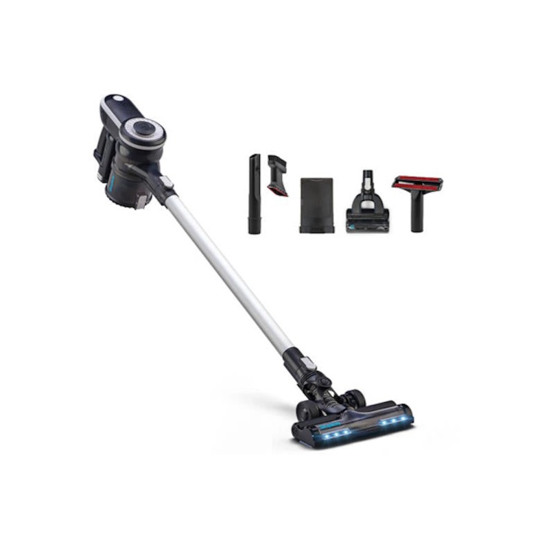 This portable vacuum is well-suited for cleaning up pet hair, since it comes with a turbo pet brush that allows you to easily clean pet hair from couches, chairs, and more. The stick vacuum also comes with a metal wand, LED carpet/bare floor nozzle, upholstery tool, and crevice/dusting combo tool, in addition to the storage/charging station and battery. This machine is bagless and cordless, and comes with two speeds. It starts off on low speed and gradually ramps up to a high speed to enable you to clean carpeted areas.