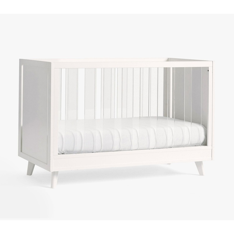 A modern take on an essential piece, this sturdy crib boasts acrylic slats to accent the clean lines. The clear slats provide an airy, open feel that seamlessly blends with your chosen design aesthetic.HOW IT IS CONSTRUCTEDSloan Acrylic Convertible CribSimply white finish is expertly crafted with a solid sap gum wood, MDF (Medium Density Fiberboard) and clear acrylic panels. Acorn finish is expertly crafted of solid eucalyptus wood, acrylic, acacia veneers and MDF.Masterfully crafted with tongue-and-groove joinery for structural integrity.Mattress platform is crafted of metal and has two height options to accommodate your growing baby.Platform can be adjusted to the following heights: 10″, 17.75″.All wood is kiln-dried, a process that ensures that the furniture will never split, warp, crack or mildew.Finish is applied in child-safe, water-based paint, which provides durability, depth of color and richness to each piece of furniture.This contract-grade item is manufactured to meet the demands of commercial use in addition to residential. Learn More.Pottery Barn Kids Lullaby 2-Stage Crib MattressDurable reinforced seam and fabric bindings offer long-lasting performance.120 interlocking coils provide optimal support.Natural cotton wrap, sleep firm layers and thermo-bonded polyester layers.Mattress edge has a reinforced border wire and Innofoam corner wraps.Two-in-one design features a firm surface for infants on one side and a foam-cushioned surface on the other side for toddlers.Each side features a distinct design: The infant side is grey with wihite moons and stars; toddler side is white with grey moons and stars.Toddler side has convoluted foam comfort layer.Vinyl mattress surface is waterproof and easy to keep clean.Beautyrest Supreme 2-Stage Crib MattressMattress is supported with 231 Beautyrest pocketed coil springs.Natural cotton wrap, sleep firm layers and thermo-bonded polyester layers provide additional support.Mattress edge has a reinforced border wire and Innofoam corner wraps.Toddler side has convoluted foam comfort layer.2 in 1 Design: The infant side provides a supportive sleeping surface while the toddler side features a layer of convoluted foam designed to provide a combination of comfort and support for active toddlers.Woven fabric cover has a waterproof backing and is phthalate compliant.Sustainability CertificatesCrib is made in a Fair Trade Certified factory, empowering workers who made it.Crib and mattresses are GREENGUARD Gold Certified. This low-emitting product has been screened for over 10,000 chemicals and VOCs to contribute to cleaner indoor air and keep you and your family safer.All foams in crib mattresses are CertiPUR-US certified which certifies the foams are made without PBDE flame retardants, mercury, lead and other heavy metals.Natural cotton fire protection meets or exceeds the highest industry safety standards; complies with U.S. and Canadian crib mattress regulations.DETAILS THAT MATTERWhen purchasing a crib, it is strongly recommended to purchase the toddler bed conversion kit at the same time.Easily adapts from crib to cozy toddler bed (conversion kit sold separately).We offer a variety of crib mattresses so you can choose the right one for your baby. All the crib mattresses we offer are compatible with all our standard cribs.KEY PRODUCT POINTSThis crib may be used until your child can easily climb out or is taller than 35 in. (89cm).All Pottery Barn Kids juvenile products are tested at 3rd party CPSC accredited labs to meet or exceed all industry voluntarily and regulatory safety requirements.Assembly required if Standard UPS delivery is selected.Imported.