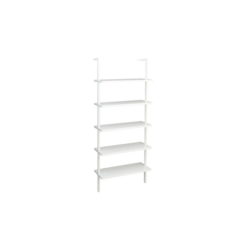 Minimalism scales for small spaces in clean, pristine white. A shorter version of our tall stairway white bookcase, five shelves ladder up in engineered wood with glossy lacquer. Slick powdercoated aluminum frame with hidden hardware accentuates spotless rise of white. Mounts sturdy to the wall. stairway white 72.5″ wall mounted bookcase is a CB2 exclusive.DETAILSWhite powdercoated aluminum frameFive engineered wood shelves with hi-gloss white lacquerMounts to wallMade in Vietnam
