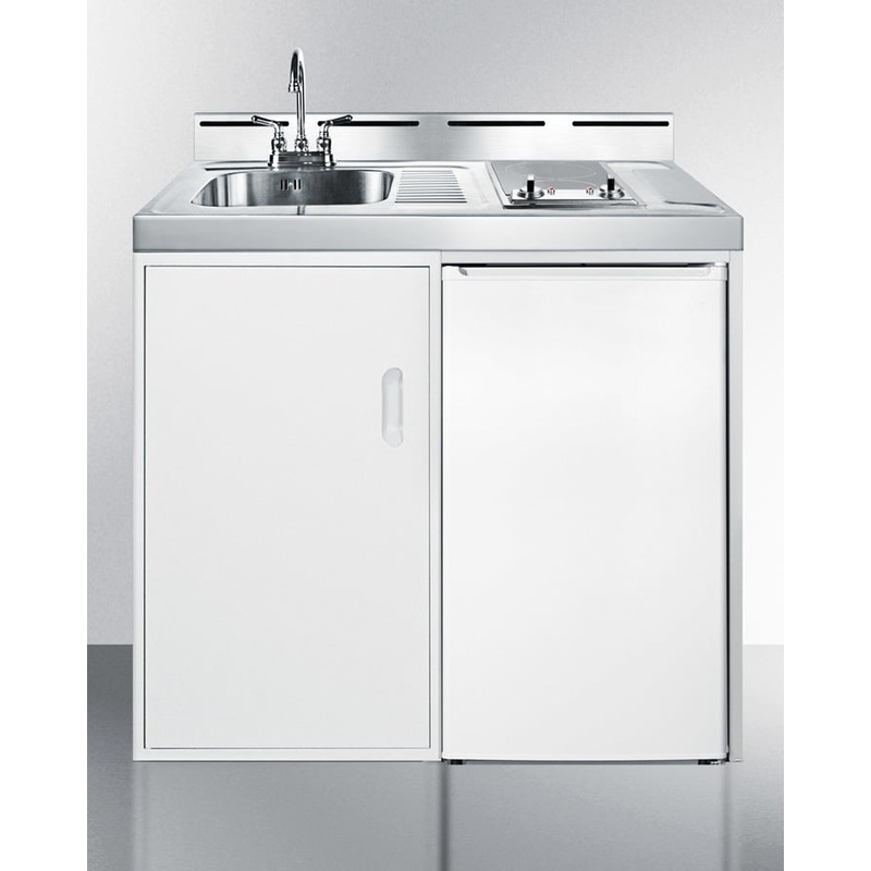 Complete All-In-One Convenience With A Refrigerator-Freezer, Cooktop, Sink, And Storage Compartment In Just 39″ (Bull)Includes Our Automatic Defrost Ff412Es Energy Star Qualified Refrigerator-Freezer (Bull)2-Burner Smooth-Top Glass Cooktop Includes Pre-Installed Cord (Bull)Perfect In Small Quarters Or As A Temporary Kitchen (Bull)Side Cabinet Offers Added Convenience For Dry Storage (Bull)24″ Depth For An Easy Fit Summit Brings True Convenience To Smaller Spaces With All-In-One Combination Kitchenettes. Available In Four Sizes, These Units Come Fully Featured With Everything You Need For The Home Foodservice Experience, Including A 2-Burner Cooktop, Sink, Storage Cabinet, And Refrigerator With A Freezer Compartment. The C39Elautoglass Is A 39″ Wide Kitchenette With An Easy-Fitting 24″ Depth. The 115V Radiant Cooktop Features A Smooth Black Ceramic Glass Surface With 6″ 600W And 7″ 900W Heating Elements And Pre-Installed Cord. The Stainless Steel Countertop Offers Durability With A Professional Look. This Unit Includes A Compact Sink With Ready-To-Use Faucet Included. A Cabinet With A Removable Shelf Is Located Below The Sink For Dry Storage. Unlike Our Competitors, Who Rarely Offer Freezers On Compact Kitchenettes, The C39Elautoglass Includes The Ff412Es Refrigerator With A Freezer Compartment. The Energy Star Certified Refrigerator-Freezer Is Made In North America And Utilizes Automatic Defrost For Minimum User Maintenance. The C39Elautoglass Is Packaged And Shipped In One Box. Perfect For Studio Apartments, Hotel Rooms, Dormitories, Assisted Living Facilities, Temporary Kitchen Facilities, And Any Other Location In Need Of A Low Maintenance, Fully Featured Compact Kitchenette.