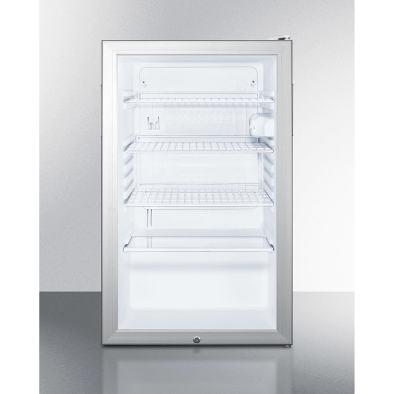 Commercially Listed For Use In Foodservice Establishments (Bull)Flexible Design Allows Built-In Or Freestanding Use In 20″ Wide Spaces (Bull)Simple Maintenance With Auto Defrost Interior (Bull)Factory Installed Lock Provides Security You Can Count On (Bull)Glass Door For Full Display Of Interior (Bull)Includes A Hospital Grade Cord With A ‘Green Dot’ Plug Accucold By Summit Appliance Carries A Quality Line Of Glass Door Refrigerators With The Scr450Lbi7 Series, Commercially Listed Built-In Undercounter Units In A Slim 20″ Width. The Etl-S Listed Scr450Lbi7 Is An All-Refrigerator With A 4.1 Cu.Ft. Capacity. It Has A White Cabinet With A Reversible Glass Door And Keyed Lock. A Hospital Grade Cord With A ‘Green Dot’ Plug Offers Additional Safety In High Traffic Areas. Inside, The Scr450Lbi7 Includes Adjustable Shelves For Attractive And Convenient Storage. The Interior Light Functions On An On/Off Rocker Switch And An Adjustable Thermostat Offers Easy Temperature Control. At Just Under 20″ Wide, Summit Scr450Lbi7 Is Ideally Sized For Any Setting And Can Function As A Built-In Or Freestanding Unit.