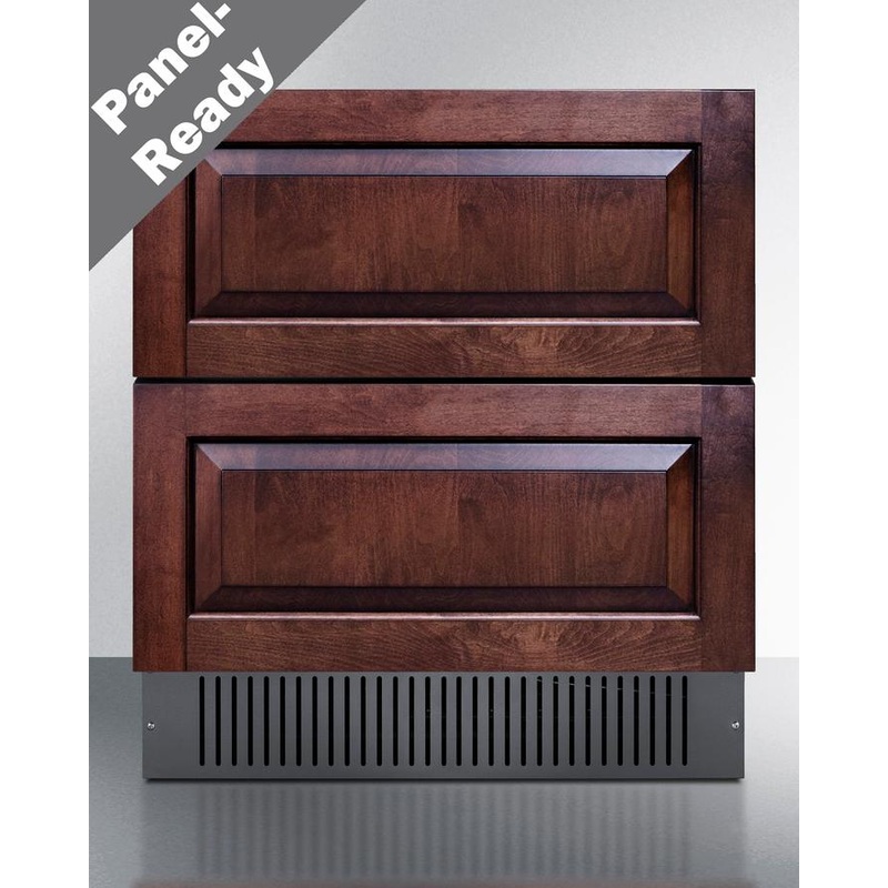 Summit is expanding its popular lineup of built-in undercounter refrigeration with new luxury choices for 30″ wide spaces in residential or commercial kitchen indoor and outdoor spaces. Model SPR3032DPNR is a panel-ready 2-drawer all-refrigerator sized just under 30″ wide and under 24″ deep for an easy fit under the counter in any kitchen with limited depth. The drawer fronts are designed to accept overlay panels (sized at 29.5″ x 13.78 at a 3/4″ thickness) to allow you to create a custom look that best suits your kitchen design. We include a set of handles for optional use, and the drawer fronts are fully finished in stainless steel if you prefer that style. The front-breathing design allows built-in installation, while the fully finished black cabinet also enables freestanding use. The sealed back and right angle plug help to ensure an easy fit. With a generous 5.42 cu.ft. interior capacity, the SPR3032DPNR is perfect for keeping a variety of items in easy reach. Each drawer includes a removable divider that lets you create four adjustable sections inside to help organize the interior. The intuitive digital control panel features a wide range from 34 to 65 F, allowing you to adjust your storage conditions for standard food items or beverages better held at warmer temperature. The temperature display can be switched from Fahrenheit to Celsius for added convenience. Both drawers feature LED lighting in a striking blue finish for elegant illumination. Frost-free operation minimizes maintenance and internal fans help to maintain an evenly cooled interior. Additional features include open drawer alarms, a child lock to prevent changes to the controls, an eco mode setting, and a 96 hour sabbath mode to disable certain features for periods of observance. The SPR3032DPNR features weatherproof construction for safe installation in outdoor kitchens. It is ETL-S listed to NSF-7 commercial standards and also complies with residential regulations for home use. In addition to this refrigerator, we also manufacture the same style in a 27″ fit, as well as 32″ high versions of both models for installation under lower ADA compliant counters. Browse Summit’s extensive selection of built-in undercounter refrigeration to discover the perfect fit for virtually any kitchen space.