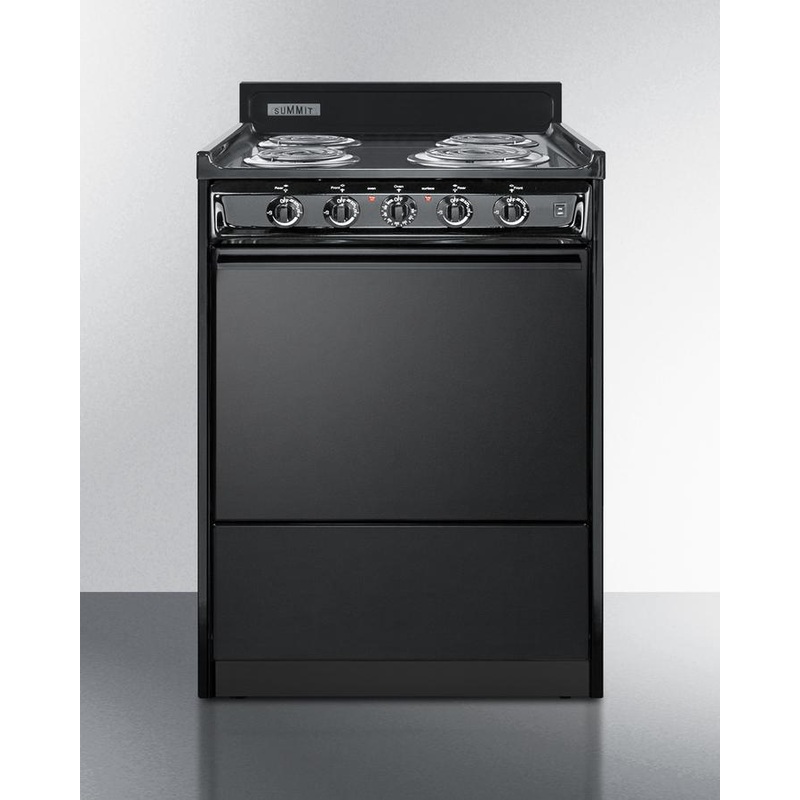 Summit Appliance offers a wide selection of American-made household ranges built for long-lasting durability in space-challenged kitchens. The TEM610C is an apartment-sized 220V electric range sized at just 24″ wide, with a generous 2.92 cu.ft oven interior that can accommodate large trays. Two adjustable oven racks are included. The waist-high broiler is located inside the oven, allowing you to switch functions without moving contents to a separate compartment on the floor. The lower drop-down storage compartment is ideal for keeping pots and pans out of the way in small kitchens. Designed to meet the most current UL safety standards, this unit features one 8″ 950W and three 6″ 650W coil elements. These operate at lower wattage than standard electric ranges, allowing for a slow but steady heating process that will not cycle off. Upfront push-to-turn knobs offer additional protection, ensuring users won’t reach over hot burners to adjust the heat. This unit complies with ADA guidelines. The TEM610C comes in a jet black finish to suit any kitchen setting. It has a recessed oven door and is conveniently sized at just 24″ deep for a better fit in galley in L-shaped kitchens, where every inch counts. Porcelain and steel construction help the unit hold up to years of daily use. We include an anti-tip bracket for added safety. This unit does not include a line cord (a standard 40 amp 3 or 4-prong cord can be installed by your electrician). With its classic style and quality construction, Summit’s made in the USA cooking line offers reliable cooking for smaller homes. Additional choices are available in 20″, 30″, and 36″ wide fits.