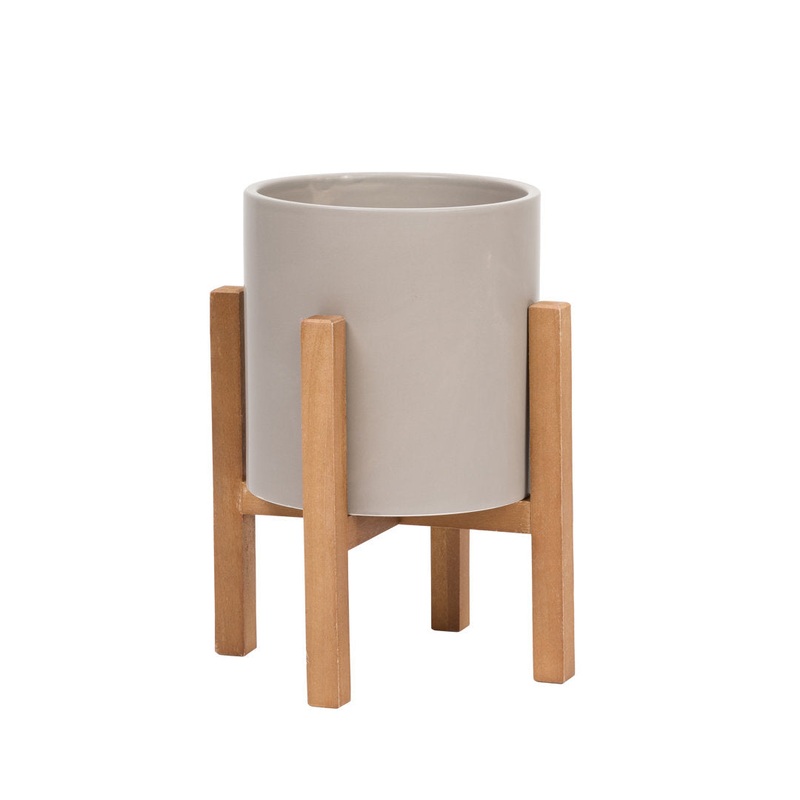 Give your favorite plants a home of their own with this ceramic pot planter, and flex your green thumb anywhere you want. Its cylindrical upper half and accompanying wood stand offer a two-tone palette that blends well with any style or color scheme. With four legs and an X-shaped support to rest the pot, this piece is a great spot to show off your plants. Take note: There are no drainage holes, so we recommend adding rocks in the bottom of the pot to improve root health. Mercury Row Size: 13″ H x 9″ W x 9″ D, Color: Gray