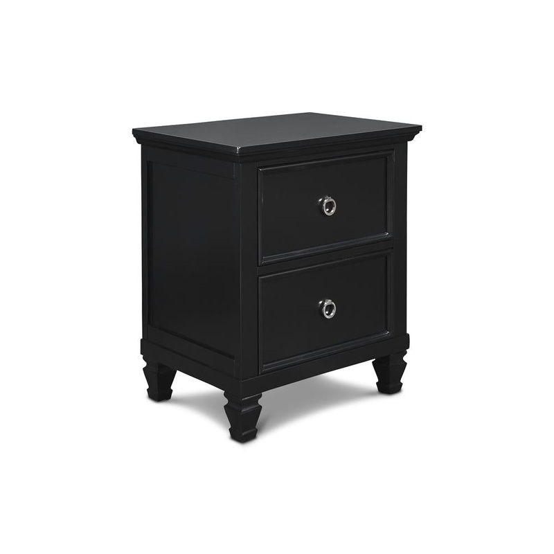 The Tamarack Two Drawer Nightstand is crafted of real wood solids and veneers for durability and strength. This bedside storage nightstand is 24″ wide by 27″ tall, providing plenty of top surface for devices, lamps and reading materials. The gleaming black finish is complemented by silver finished round drawer pulls. The roomy drawers roll smoothly on side mounted drawer glides and are constructed with 4-corner English dovetail joinery for long lasting use. The versatile style of the nightstand fits into transitional, traditional and contemporary styles, perfect for a bedroom, kid’s room or even your living room.