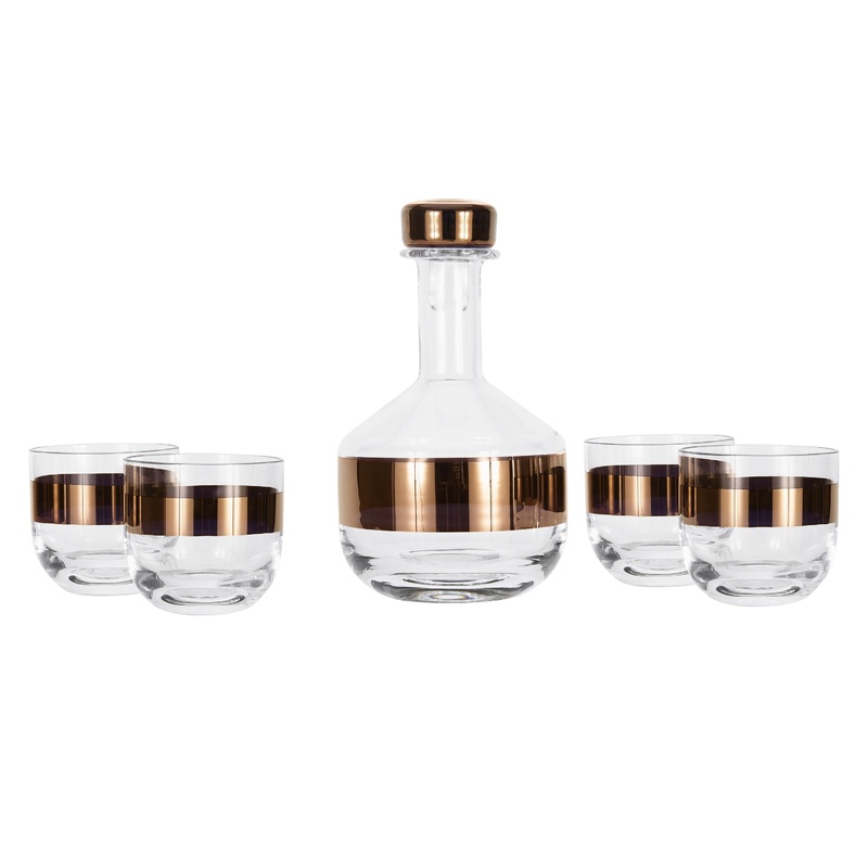 A Tank Whiskey Decanter for your best Scotch or Bourbon, presented in gift-worthy packaging. Mouth-blown and ornamented with hand-painted copper detailing, it forms part of a collection alongside other Tank glassware and tableware.