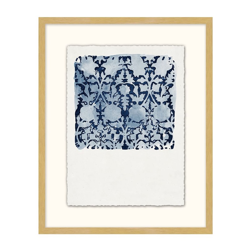 The original artwork of these detailed gicle reproductions were watercolors of vintage textiles in floral and geometric patterns.Mat board, natural wood frame and glass front.Gicle is deckled and floating over white bottom mat.Backed with D-rings for hanging.Made in the USA.