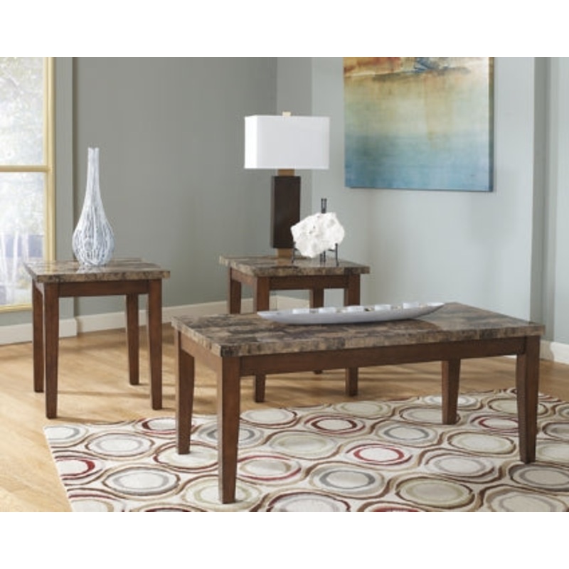 We love how this coffee table set is the perfect pairing of clean-lined contemporary style with a warm, earthy vibe. The soothing shades and textured vein of the faux marble tabletops perfectly complement the richly rustic wood-color finish.