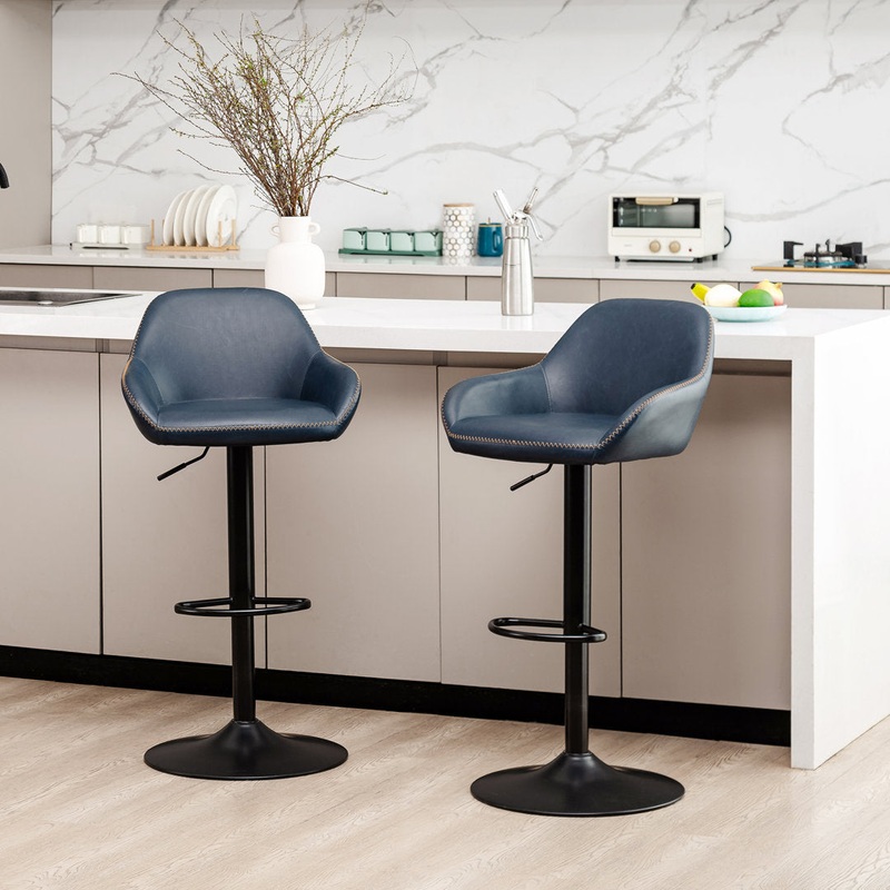 This 2-piece set of swivel counter stools completes your kitchen or home bar with a sleek mix of materials. the frames are crafted from steel with a matte black finish, and they rest on an elegant pedestal base. This matching set features a bucket seat with flared arms and a full back for lots of support. And they’re upholstered in leather-like polyurethane with playful, rick-rack stitching along the perimeter. We love that these counter stools also have built-in ring footrests and swiveling functions, making it easy to keep up with the conversation. Mistana Color: Navy Blue