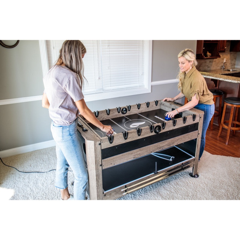 The Triumph 56 4-in-1 Swivel Multi-Game Table allows you to play 4 different games from the convenience of one table! In a matter of seconds, easily switch from air-powered hockey to billiards, table tennis, or foosball. Other swivel tables on the market of this size will only push the puck or hover the puck leading to slow and clumsy game play. The Triumph 56 4-in-1 Swivel Multi-Game Table uses a patented central air distribution system for even air flow throughout the table resulting in fast and furious air hockey game. The 56 table size is ideal for authentic gaming action and is the official foosball playfield size. This table includes end and side brace support beams for increased strength and durability and comes with all accessories need to play all four games. Triumph Sports