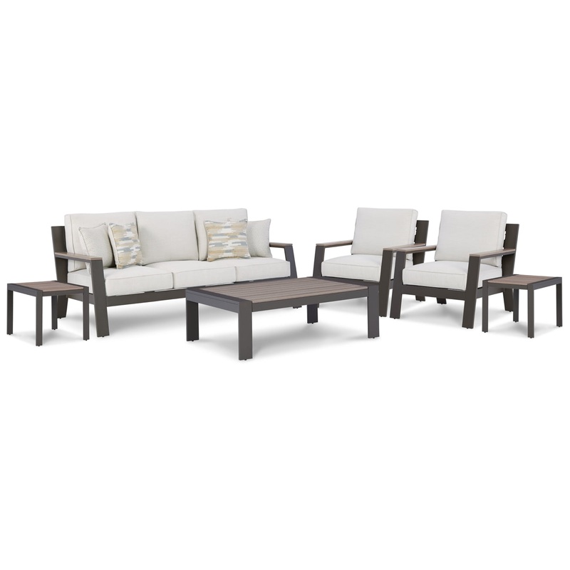 Natural neutrals are all the rage these days. Embrace the style trend with this outdoor seating package. Crafted with a mix of aluminum and an HDPE material for exceptional durability and weather resistance, the comfortably cushioned seats with accompanying coffee table and end tables take outdoor living to a whole new level.