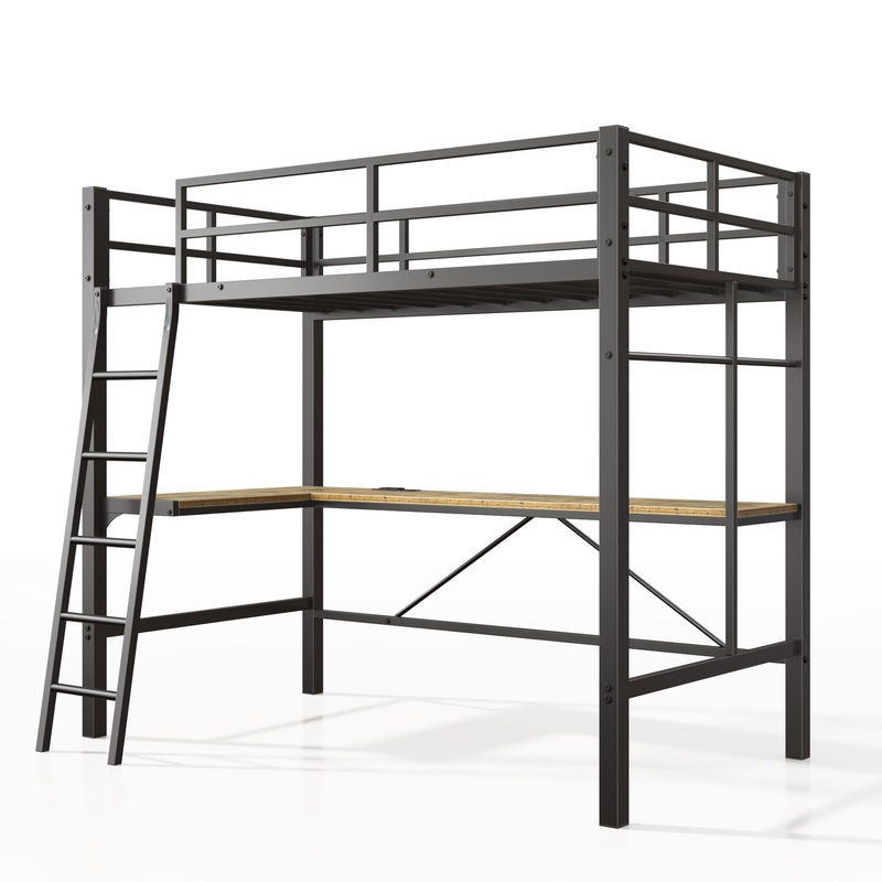 Twin Metal Loft Bed With L – Shaped Desk, Charging Station Loft Bed Frame Twin Size, Safety Guard & Ladder, No Box Spring Needed – Black