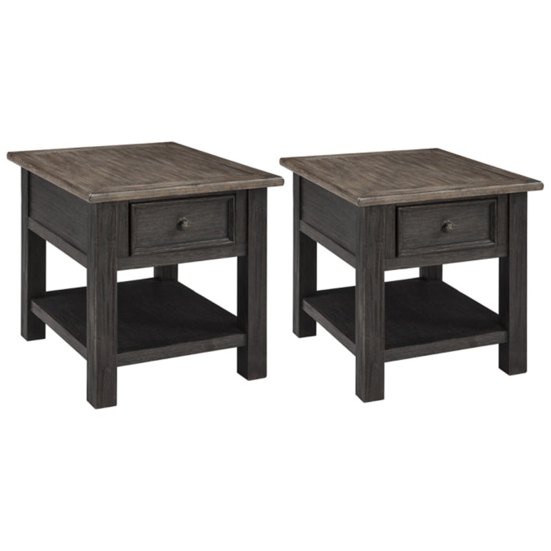 Shabby chic with a hint of down home country. This 2-piece rectangular end table with textured black finish is all the talk of todays design world. Wood grain shows through the weathered gray-brown top in all of its earthy pleasure. Framed drawer is adorned with lovely traditional hardware.
