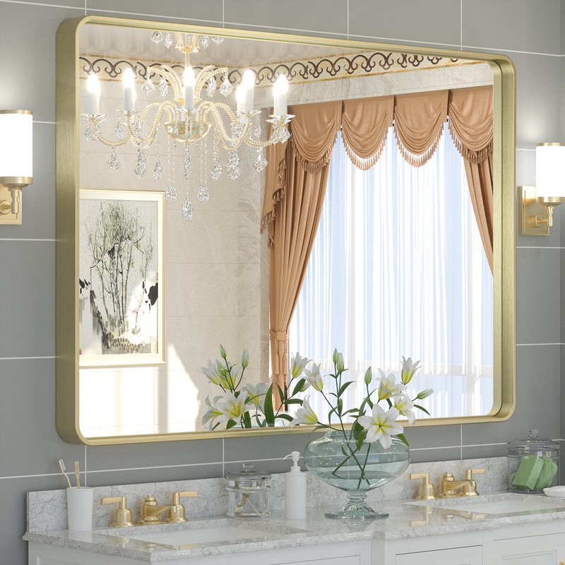 Complete your house decor with this modern contemporary rectangle mirror. This framed mirror is crafted with aluminum alloy frame with excellent surface process(powder coated/brushed/frosted),which is highly resistant to corrosion, moist or water.4mm high-definition shatterproof tempered glass provides both safety and excellent reflection with no distortion. Comes with French-cleat hardware, this bathroom mirror is easy to be hung on wall or just lean against wall according to your need. This multi-use mirror fits perfectly in all house scenarios: bathroom, living room, bedroom, dressing room, hallway, aisle, etc. Latitude Run Finish: Gold, Shape: Rectangle, Size: 36″ x 48″