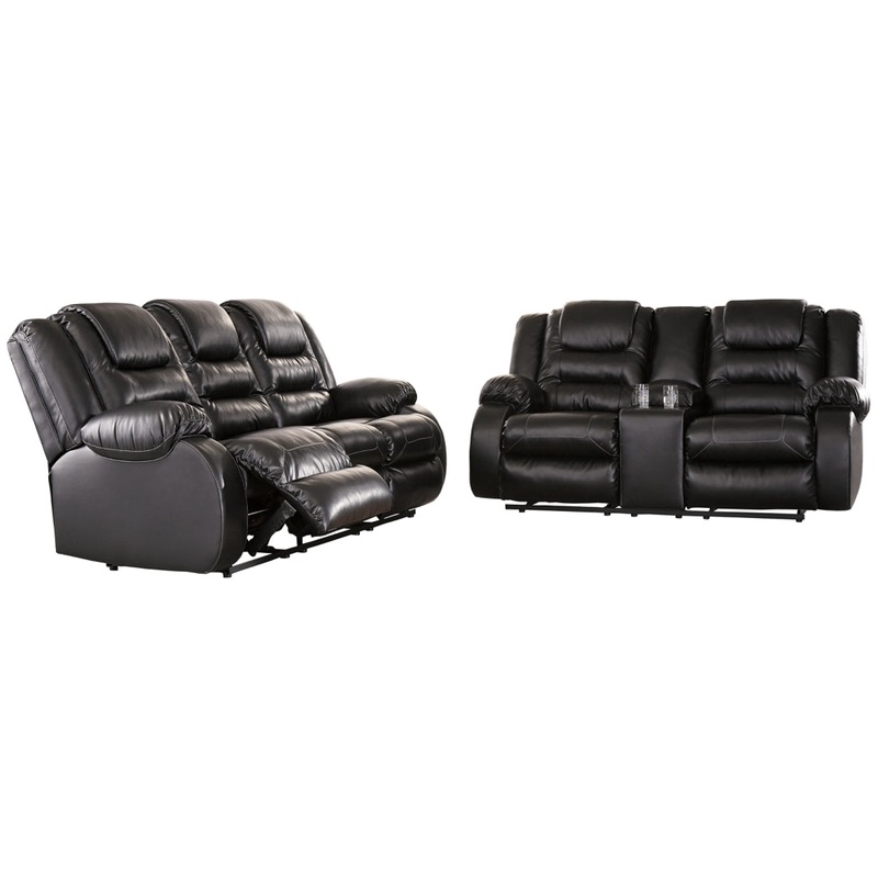 - Includes reclining sofa and reclining loveseat with console