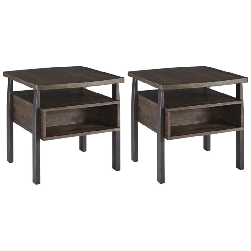 This 2-piece end table set opens our eyes to the beauty of contemporary style with a rustic attitude. Its clean-lined, open-concept design is dressed to impress with a two-tone finish that blends a grayish brown wire-brushed effect with a contrasting faux metal color.