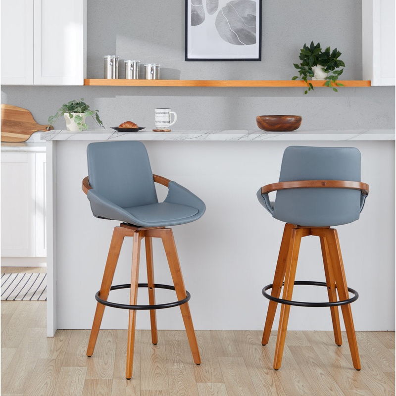 This bucket stool adds a mid-century modern feel to your kitchen or bar with its airy design and thin splayed legs. It’s crafted from solid wood, and its foam-filled seat comes upholstered in your choice of color. We love that this chair has a built-in footrest for added support. Plus, its 360 swivel seat lets you freely rotate while chatting with friends. This stool requires partial assembly, but it comes with everything needed to make setup a breeze. Wade Logan Seat Height: Bar Stool (29″ Seat Height), Upholstery: Gray Faux Leather
