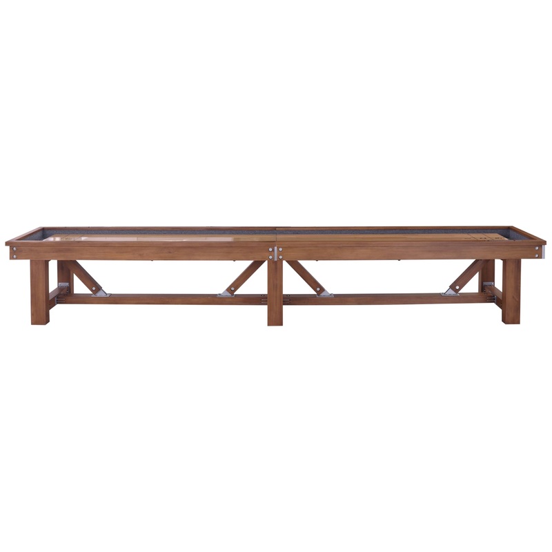 The Willow Bend Pro-Series Shuffleboard Table with Butcher Block from Playcraft combines timeless design with modern rustic elegance. Crafted from solid wood with metal accents, it features a premium hardwood playfield finished with poured polymer for smooth, precise gameplay. Its sturdy frame and reinforced supports ensure lasting stability, while the warm wood finish adds refined charm. Optional buffet top enhances entertaining, making this table a sophisticated centerpiece for any game room or lounge.