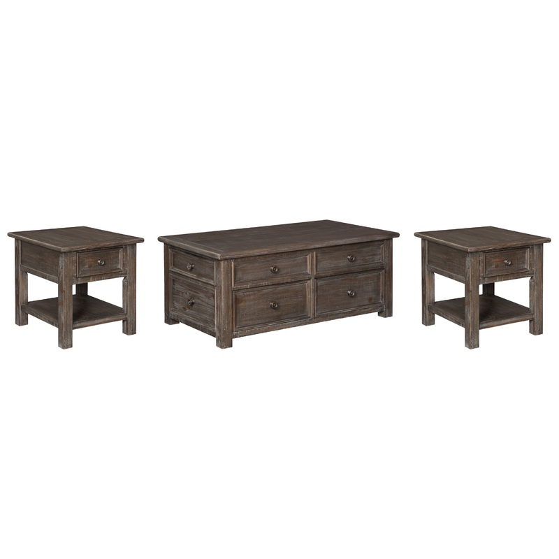 Inspired by heavy and hearty lodge-style furnishings from days gone by, this occasional table set brings the past brilliantly into the present. Distinctive details include robust mouldings, raised drawer fronts for rich dimension and a distressed aged pine color finish with light wire-brushed texture thats pure artistry.
