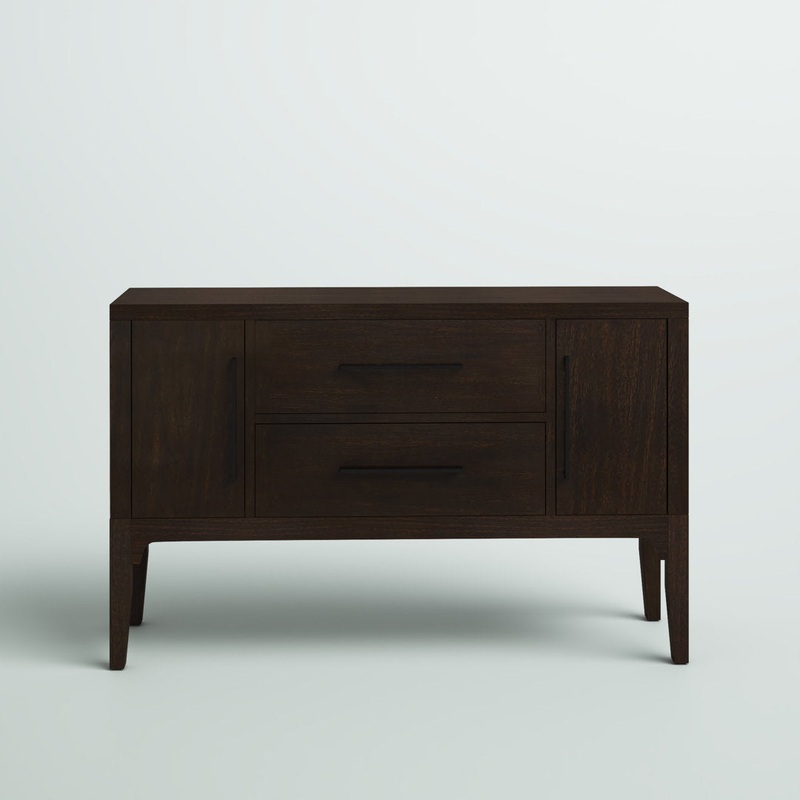 This sideboard brings clean lines and convenient storage to your entryway, living room, or dining room. It’s made from solid wood with a brown finish that highlights the wood’s natural grain variation, and it features purposeful distressing for a lightly weathered feel. Store everything from barware to dinnerware in its two side cabinets with adjustable interior shelves, and tuck away essentials in its two drawers. This versatile server features a 54″ wide surface for buffet dishes, display items, and more. Sleek and streamlined, it complements industrial and modern decor styles alike. Red Barrel Studio